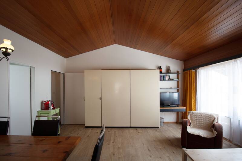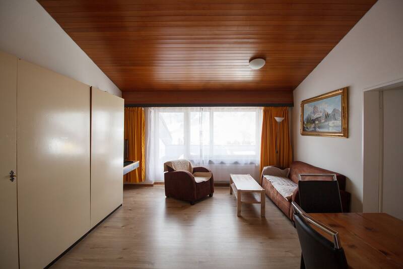 Helle 2.5-Zimmerwohnung im 3. Stock, Baujahr ca. 1973, Balkon, ca. 61m2. Wohnzimmer mit 2 Schrankbetten, Küche, Schlafzimmer mit 2 Einzelbetten und ein Schrankbett, Kinderbett, Badezimmer mit Dusche. Skiraum. Garage optional + CHF 30‘000.00